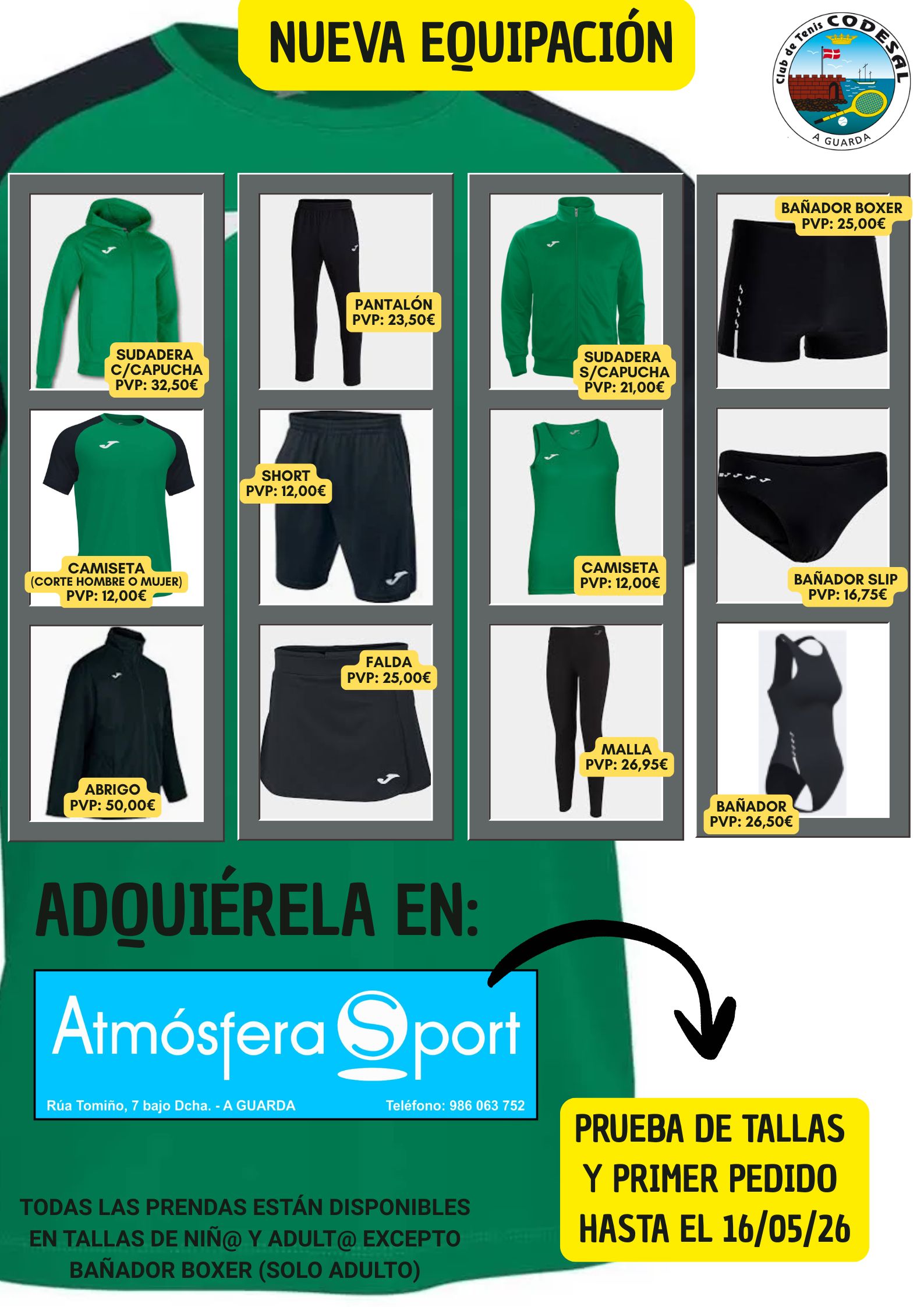 Nueva equipación! 23/04/2026 Comunicaciones, Cursos, Natación, Padel, Pickleball, Tenis 0 Ya puedes adquirir la nueva equipación en Atmósfera Sport A Guarda! COMPARTIR Facebook Twitter LinkedIn Email Articulo anteriorSiguiente artículo Post by sonia